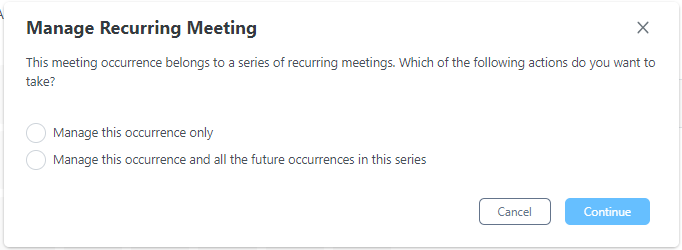 2. The **Manage Recurring Meeting** dialog box appears, prompting you to change your recurring meeting. Select the desired option: Manage this occurrence only, or Manage this occurrence and all future occurrences in this series, and click **Continue**.