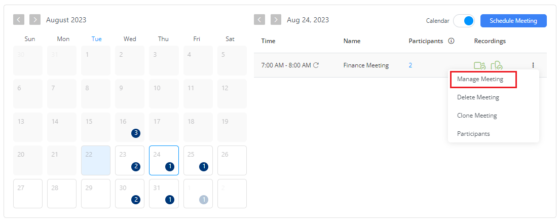 Manage Meeting feature allows you to update the scheduled meetings. It will enable you to update the meeting title, time, frequency, and another update for a scheduled meeting.