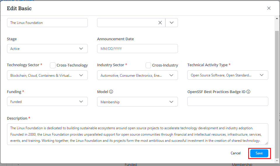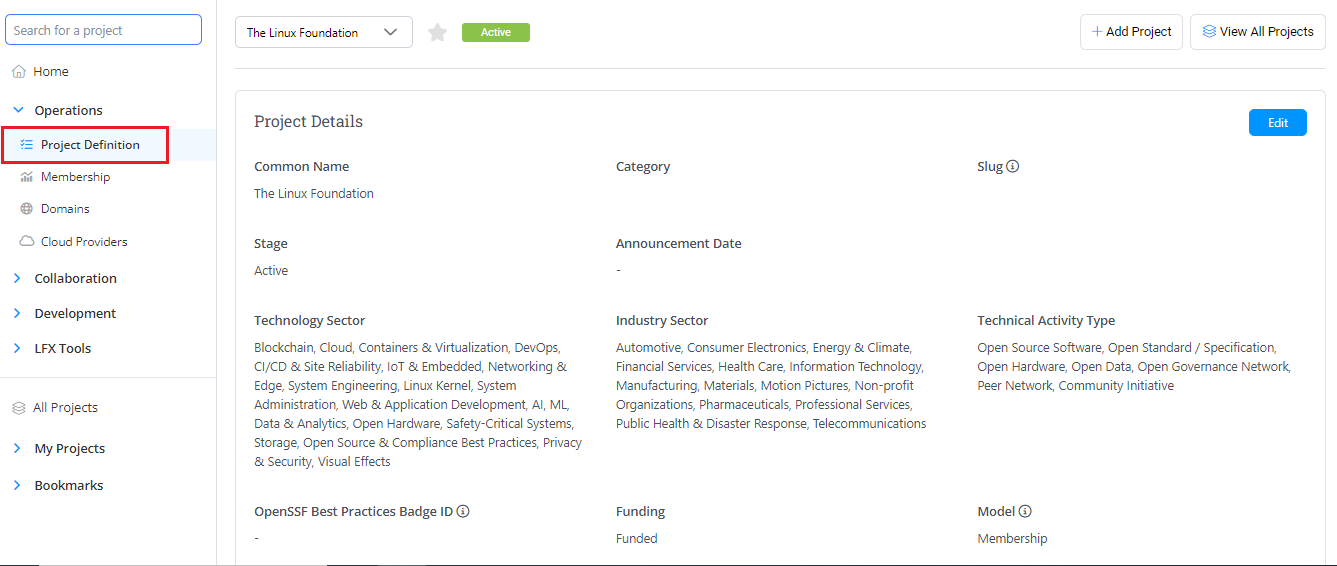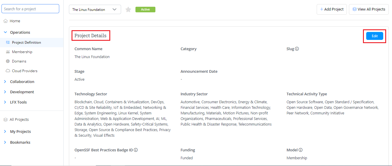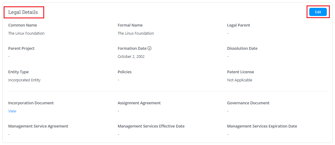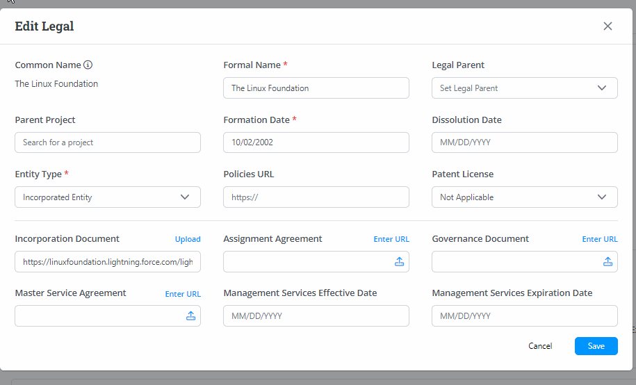 | **Legal Parent**                       | <p>This field provides info on the legal entity of the project. The legal entity serves as the parent organization of the project.</p><p>To select the legal parent use a dropdown menu with predefined options or an autocomplete feature.</p><ul><li>You should not enter any values in this field. This information will be gathered from Joint Development Foundation Projects, LLC" or "LF Projects, LLC".</li><li>This field applies to series LLC projects.</li></ul>                                                                                                                                                                                                                                                                                                                |