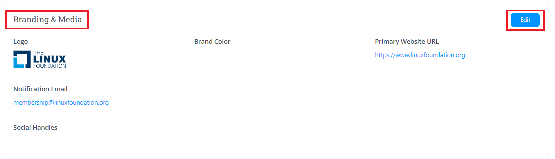 2. Click **Edit** from the Branding and Media section to update branding and media information.