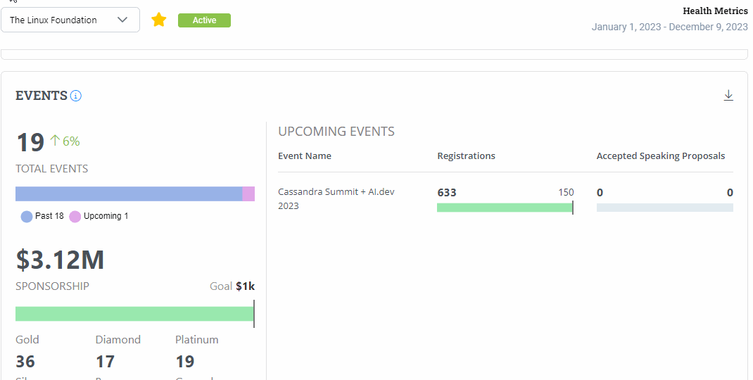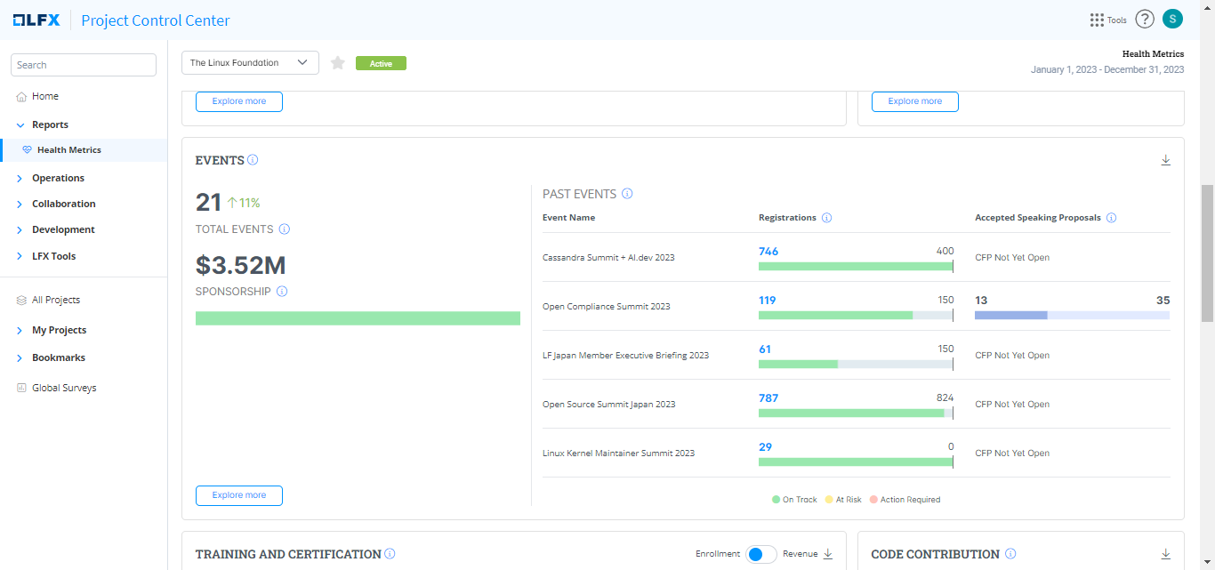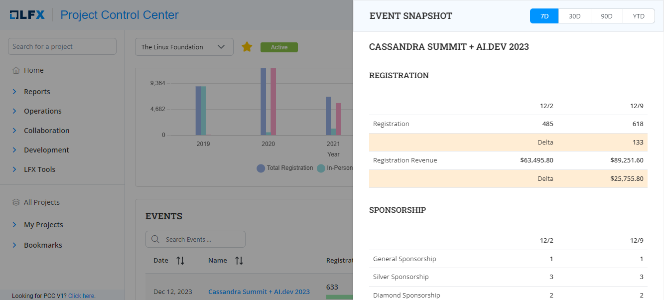 The **Events** dashboard in the LFX PCC provides an overview of your project's event-related metrics, including upcoming events, sponsorship details, and registration statistics.