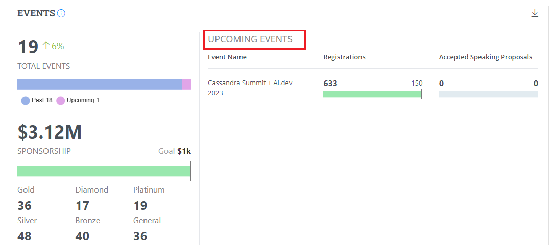 Upcoming Events provides you with the details of the forthcoming events, such as the total number of registration and the total goal set for the registration. It also provides you with more information related to the speakers. It gives you the total number of speakers accepted out of the total number of registered speakers.