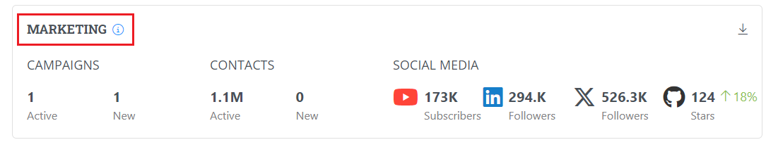 * **Social Media:** The number of subscribers, followers, and stars along with their growth rates provide insights into the engagement and popularity of your brand across different social media platforms.