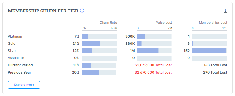 Click **Explore More** CTA to navigate to the detailed dedicated page where you can see the specific factors contributing to membership churn, view historical trends, and analyze patterns over time.