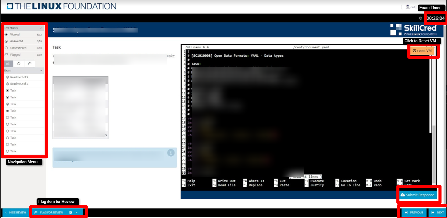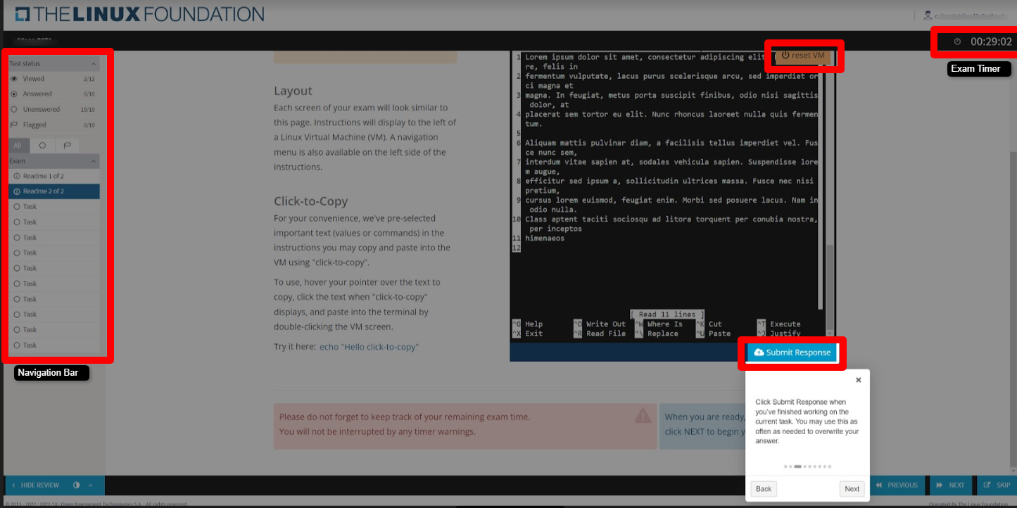 * Exam task instructions will display to the left of the Linux Virtual Machine