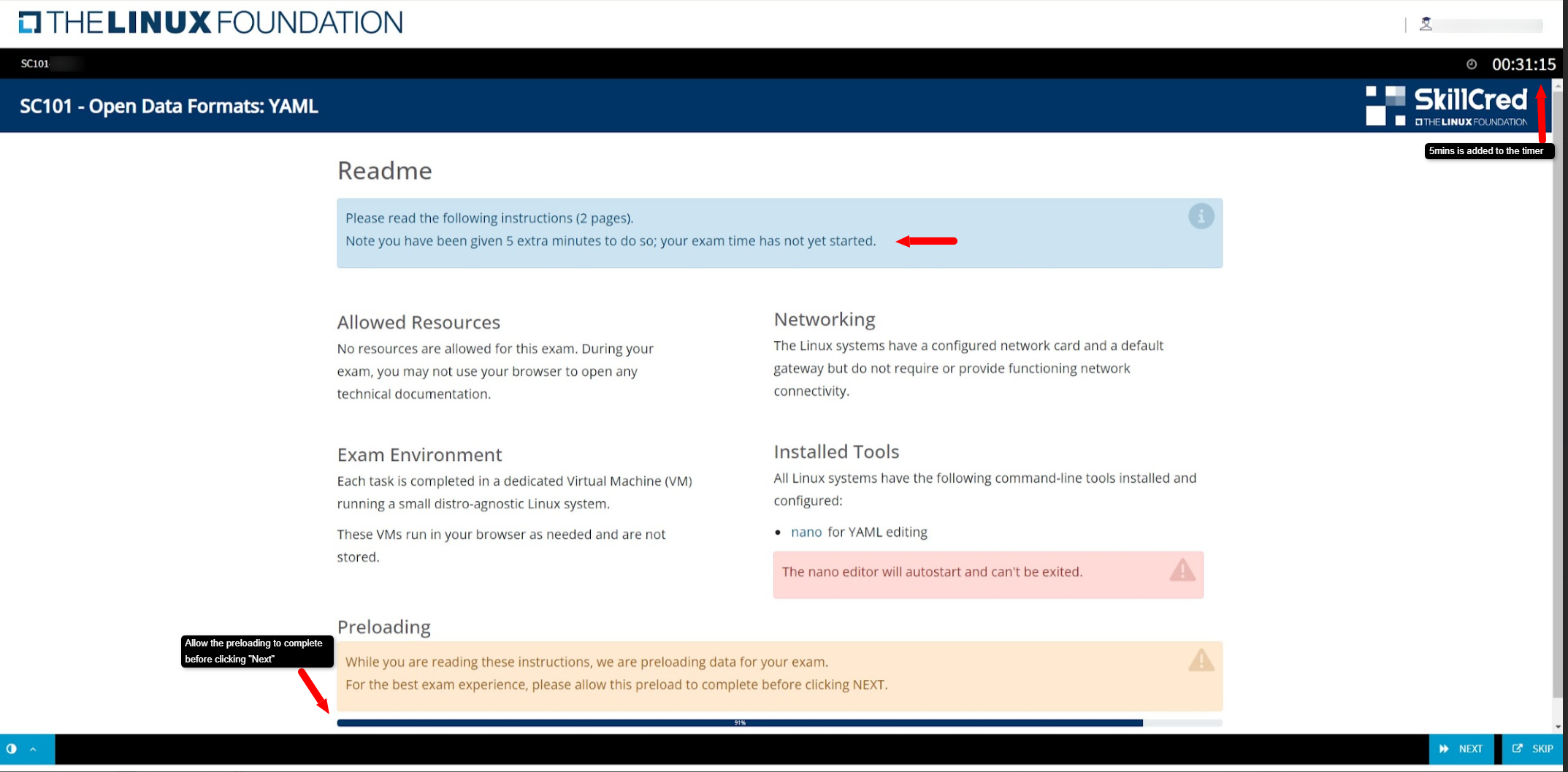 The SkillCred Exams will launch and display 2 "Read Me" Pages, that contain valuable information on how to navigate the Exam UI and controls.