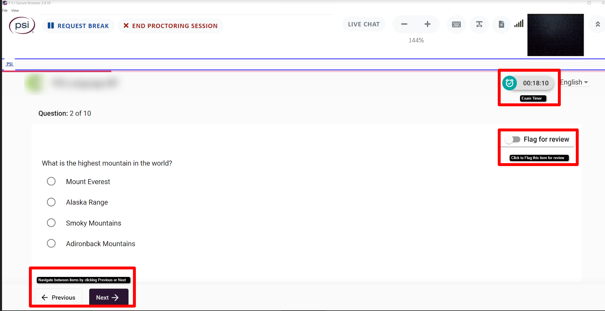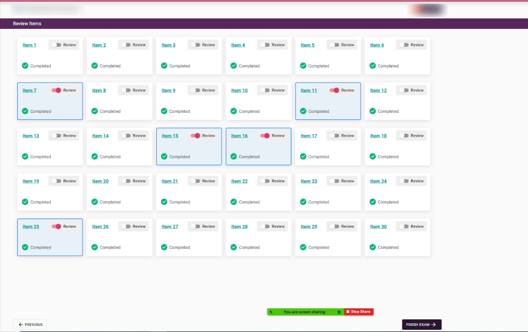 * The candidate can "Flag" an item for later review. This items will be highlighted on the "Review Screen" and they can return to the item to update your answer.